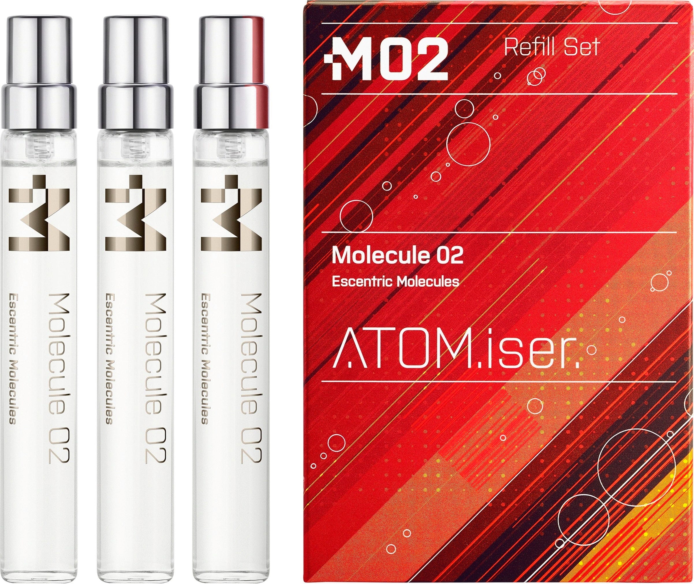 The Molecule 02 ATOM.iser Refill Set by Escentric Molecules consists of 3 eaux de toilette for refilling the ATOM.iser, a luxurious, handy travel case.