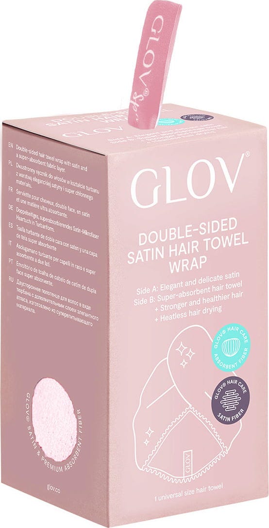 The reversible turban can be worn on both sides. The super-absorbent GLOV® microfibre absorbs moisture after washing the hair while the satin side can be worn outdoors. When the satin side is reversed, it prevents hair breakage, frizz and tangling. The hair wrap is ideal for curly hair or can be worn as a sophisticated accessory outdoors for a clean and polished look when the hair is wet.