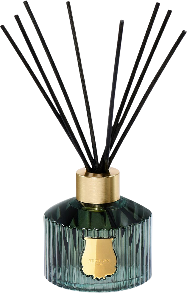 The Figuerie diffuser by Trudon is made of iconic green glass and decorated with a golden emblem. The diffuser is handmade in the Trudon factory in France and is topped with an aluminium ring. A total of 8 black, natural rattan sticks are inserted through the ring to distribute the fragrance evenly throughout the room.